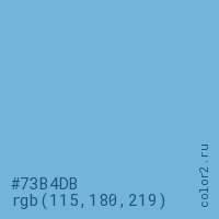Цвет #73B4DB в цветовой модели RGB обозначается тремя октетами (115, 180, 219) в десятичном формате и #73B4DB в шестнадцатиричном (hex) формате, которые являются интенсивностью красного 115 (hex 73), интенсивность зелёного 180 (hex B4) и интенсивность синего 219 (hex DB).