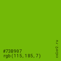 Цвет #73B907 в цветовой модели RGB обозначается тремя октетами (115, 185, 7) в десятичном формате и #73B907 в шестнадцатиричном (hex) формате, которые являются интенсивностью красного 115 (hex 73), интенсивность зелёного 185 (hex B9) и интенсивность синего 7 (hex 07).