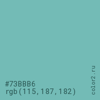 Цвет #73BBB6 в цветовой модели RGB обозначается тремя октетами (115, 187, 182) в десятичном формате и #73BBB6 в шестнадцатиричном (hex) формате, которые являются интенсивностью красного 115 (hex 73), интенсивность зелёного 187 (hex BB) и интенсивность синего 182 (hex B6).