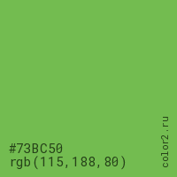 Цвет #73BC50 в цветовой модели RGB обозначается тремя октетами (115, 188, 80) в десятичном формате и #73BC50 в шестнадцатиричном (hex) формате, которые являются интенсивностью красного 115 (hex 73), интенсивность зелёного 188 (hex BC) и интенсивность синего 80 (hex 50).
