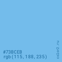 Цвет #73BCEB в цветовой модели RGB обозначается тремя октетами (115, 188, 235) в десятичном формате и #73BCEB в шестнадцатиричном (hex) формате, которые являются интенсивностью красного 115 (hex 73), интенсивность зелёного 188 (hex BC) и интенсивность синего 235 (hex EB).