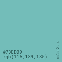 Цвет #73BDB9 в цветовой модели RGB обозначается тремя октетами (115, 189, 185) в десятичном формате и #73BDB9 в шестнадцатиричном (hex) формате, которые являются интенсивностью красного 115 (hex 73), интенсивность зелёного 189 (hex BD) и интенсивность синего 185 (hex B9).