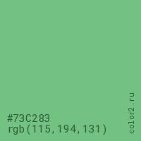 Цвет #73C283 в цветовой модели RGB обозначается тремя октетами (115, 194, 131) в десятичном формате и #73C283 в шестнадцатиричном (hex) формате, которые являются интенсивностью красного 115 (hex 73), интенсивность зелёного 194 (hex C2) и интенсивность синего 131 (hex 83).