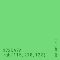 Цвет #73DA7A в цветовой модели RGB обозначается тремя октетами (115, 218, 122) в десятичном формате и #73DA7A в шестнадцатиричном (hex) формате, которые являются интенсивностью красного 115 (hex 73), интенсивность зелёного 218 (hex DA) и интенсивность синего 122 (hex 7A).