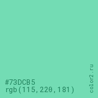 Цвет #73DCB5 в цветовой модели RGB обозначается тремя октетами (115, 220, 181) в десятичном формате и #73DCB5 в шестнадцатиричном (hex) формате, которые являются интенсивностью красного 115 (hex 73), интенсивность зелёного 220 (hex DC) и интенсивность синего 181 (hex B5).