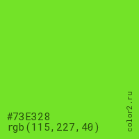 Цвет #73E328 в цветовой модели RGB обозначается тремя октетами (115, 227, 40) в десятичном формате и #73E328 в шестнадцатиричном (hex) формате, которые являются интенсивностью красного 115 (hex 73), интенсивность зелёного 227 (hex E3) и интенсивность синего 40 (hex 28).