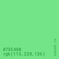Цвет #73E488 в цветовой модели RGB обозначается тремя октетами (115, 228, 136) в десятичном формате и #73E488 в шестнадцатиричном (hex) формате, которые являются интенсивностью красного 115 (hex 73), интенсивность зелёного 228 (hex E4) и интенсивность синего 136 (hex 88).