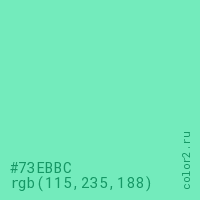 Цвет #73EBBC в цветовой модели RGB обозначается тремя октетами (115, 235, 188) в десятичном формате и #73EBBC в шестнадцатиричном (hex) формате, которые являются интенсивностью красного 115 (hex 73), интенсивность зелёного 235 (hex EB) и интенсивность синего 188 (hex BC).