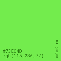 Цвет #73EC4D в цветовой модели RGB обозначается тремя октетами (115, 236, 77) в десятичном формате и #73EC4D в шестнадцатиричном (hex) формате, которые являются интенсивностью красного 115 (hex 73), интенсивность зелёного 236 (hex EC) и интенсивность синего 77 (hex 4D).