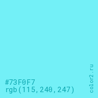 Цвет #73F0F7 в цветовой модели RGB обозначается тремя октетами (115, 240, 247) в десятичном формате и #73F0F7 в шестнадцатиричном (hex) формате, которые являются интенсивностью красного 115 (hex 73), интенсивность зелёного 240 (hex F0) и интенсивность синего 247 (hex F7).