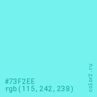 Цвет #73F2EE в цветовой модели RGB обозначается тремя октетами (115, 242, 238) в десятичном формате и #73F2EE в шестнадцатиричном (hex) формате, которые являются интенсивностью красного 115 (hex 73), интенсивность зелёного 242 (hex F2) и интенсивность синего 238 (hex EE).