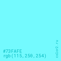 Цвет #73FAFE в цветовой модели RGB обозначается тремя октетами (115, 250, 254) в десятичном формате и #73FAFE в шестнадцатиричном (hex) формате, которые являются интенсивностью красного 115 (hex 73), интенсивность зелёного 250 (hex FA) и интенсивность синего 254 (hex FE).
