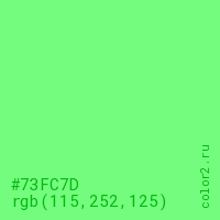 Цвет #73FC7D в цветовой модели RGB обозначается тремя октетами (115, 252, 125) в десятичном формате и #73FC7D в шестнадцатиричном (hex) формате, которые являются интенсивностью красного 115 (hex 73), интенсивность зелёного 252 (hex FC) и интенсивность синего 125 (hex 7D).