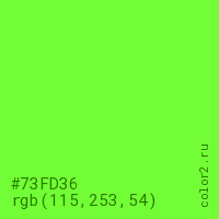 Цвет #73FD36 в цветовой модели RGB обозначается тремя октетами (115, 253, 54) в десятичном формате и #73FD36 в шестнадцатиричном (hex) формате, которые являются интенсивностью красного 115 (hex 73), интенсивность зелёного 253 (hex FD) и интенсивность синего 54 (hex 36).