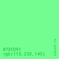 Цвет #73FD91 в цветовой модели RGB обозначается тремя октетами (115, 253, 145) в десятичном формате и #73FD91 в шестнадцатиричном (hex) формате, которые являются интенсивностью красного 115 (hex 73), интенсивность зелёного 253 (hex FD) и интенсивность синего 145 (hex 91).