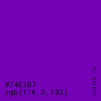 Цвет #7403B7 в цветовой модели RGB обозначается тремя октетами (116, 3, 183) в десятичном формате и #7403B7 в шестнадцатиричном (hex) формате, которые являются интенсивностью красного 116 (hex 74), интенсивность зелёного 3 (hex 03) и интенсивность синего 183 (hex B7).