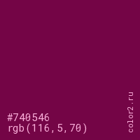 Цвет #740546 в цветовой модели RGB обозначается тремя октетами (116, 5, 70) в десятичном формате и #740546 в шестнадцатиричном (hex) формате, которые являются интенсивностью красного 116 (hex 74), интенсивность зелёного 5 (hex 05) и интенсивность синего 70 (hex 46).