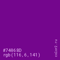 Цвет #74068D в цветовой модели RGB обозначается тремя октетами (116, 6, 141) в десятичном формате и #74068D в шестнадцатиричном (hex) формате, которые являются интенсивностью красного 116 (hex 74), интенсивность зелёного 6 (hex 06) и интенсивность синего 141 (hex 8D).