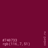Цвет #740733 в цветовой модели RGB обозначается тремя октетами (116, 7, 51) в десятичном формате и #740733 в шестнадцатиричном (hex) формате, которые являются интенсивностью красного 116 (hex 74), интенсивность зелёного 7 (hex 07) и интенсивность синего 51 (hex 33).