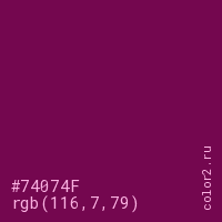 Цвет #74074F в цветовой модели RGB обозначается тремя октетами (116, 7, 79) в десятичном формате и #74074F в шестнадцатиричном (hex) формате, которые являются интенсивностью красного 116 (hex 74), интенсивность зелёного 7 (hex 07) и интенсивность синего 79 (hex 4F).