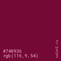 Цвет #740936 в цветовой модели RGB обозначается тремя октетами (116, 9, 54) в десятичном формате и #740936 в шестнадцатиричном (hex) формате, которые являются интенсивностью красного 116 (hex 74), интенсивность зелёного 9 (hex 09) и интенсивность синего 54 (hex 36).