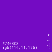 Цвет #740BC3 в цветовой модели RGB обозначается тремя октетами (116, 11, 195) в десятичном формате и #740BC3 в шестнадцатиричном (hex) формате, которые являются интенсивностью красного 116 (hex 74), интенсивность зелёного 11 (hex 0B) и интенсивность синего 195 (hex C3).