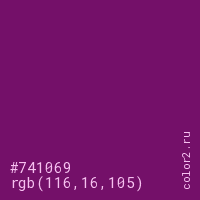 Цвет #741069 в цветовой модели RGB обозначается тремя октетами (116, 16, 105) в десятичном формате и #741069 в шестнадцатиричном (hex) формате, которые являются интенсивностью красного 116 (hex 74), интенсивность зелёного 16 (hex 10) и интенсивность синего 105 (hex 69).