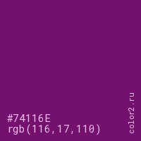 Цвет #74116E в цветовой модели RGB обозначается тремя октетами (116, 17, 110) в десятичном формате и #74116E в шестнадцатиричном (hex) формате, которые являются интенсивностью красного 116 (hex 74), интенсивность зелёного 17 (hex 11) и интенсивность синего 110 (hex 6E).