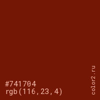 Цвет #741704 в цветовой модели RGB обозначается тремя октетами (116, 23, 4) в десятичном формате и #741704 в шестнадцатиричном (hex) формате, которые являются интенсивностью красного 116 (hex 74), интенсивность зелёного 23 (hex 17) и интенсивность синего 4 (hex 04).