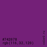 Цвет #742078 в цветовой модели RGB обозначается тремя октетами (116, 32, 120) в десятичном формате и #742078 в шестнадцатиричном (hex) формате, которые являются интенсивностью красного 116 (hex 74), интенсивность зелёного 32 (hex 20) и интенсивность синего 120 (hex 78).