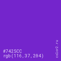 Цвет #7425CC в цветовой модели RGB обозначается тремя октетами (116, 37, 204) в десятичном формате и #7425CC в шестнадцатиричном (hex) формате, которые являются интенсивностью красного 116 (hex 74), интенсивность зелёного 37 (hex 25) и интенсивность синего 204 (hex CC).