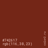 Цвет #742617 в цветовой модели RGB обозначается тремя октетами (116, 38, 23) в десятичном формате и #742617 в шестнадцатиричном (hex) формате, которые являются интенсивностью красного 116 (hex 74), интенсивность зелёного 38 (hex 26) и интенсивность синего 23 (hex 17).