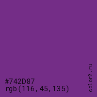 Цвет #742D87 в цветовой модели RGB обозначается тремя октетами (116, 45, 135) в десятичном формате и #742D87 в шестнадцатиричном (hex) формате, которые являются интенсивностью красного 116 (hex 74), интенсивность зелёного 45 (hex 2D) и интенсивность синего 135 (hex 87).
