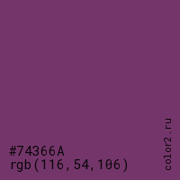Цвет #74366A в цветовой модели RGB обозначается тремя октетами (116, 54, 106) в десятичном формате и #74366A в шестнадцатиричном (hex) формате, которые являются интенсивностью красного 116 (hex 74), интенсивность зелёного 54 (hex 36) и интенсивность синего 106 (hex 6A).