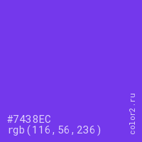 Цвет #7438EC в цветовой модели RGB обозначается тремя октетами (116, 56, 236) в десятичном формате и #7438EC в шестнадцатиричном (hex) формате, которые являются интенсивностью красного 116 (hex 74), интенсивность зелёного 56 (hex 38) и интенсивность синего 236 (hex EC).