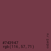 Цвет #743947 в цветовой модели RGB обозначается тремя октетами (116, 57, 71) в десятичном формате и #743947 в шестнадцатиричном (hex) формате, которые являются интенсивностью красного 116 (hex 74), интенсивность зелёного 57 (hex 39) и интенсивность синего 71 (hex 47).