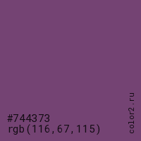 Цвет #744373 в цветовой модели RGB обозначается тремя октетами (116, 67, 115) в десятичном формате и #744373 в шестнадцатиричном (hex) формате, которые являются интенсивностью красного 116 (hex 74), интенсивность зелёного 67 (hex 43) и интенсивность синего 115 (hex 73).