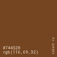 Цвет #744520 в цветовой модели RGB обозначается тремя октетами (116, 69, 32) в десятичном формате и #744520 в шестнадцатиричном (hex) формате, которые являются интенсивностью красного 116 (hex 74), интенсивность зелёного 69 (hex 45) и интенсивность синего 32 (hex 20).