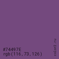 Цвет #74497E в цветовой модели RGB обозначается тремя октетами (116, 73, 126) в десятичном формате и #74497E в шестнадцатиричном (hex) формате, которые являются интенсивностью красного 116 (hex 74), интенсивность зелёного 73 (hex 49) и интенсивность синего 126 (hex 7E).