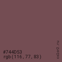 Цвет #744D53 в цветовой модели RGB обозначается тремя октетами (116, 77, 83) в десятичном формате и #744D53 в шестнадцатиричном (hex) формате, которые являются интенсивностью красного 116 (hex 74), интенсивность зелёного 77 (hex 4D) и интенсивность синего 83 (hex 53).