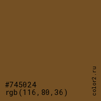 Цвет #745024 в цветовой модели RGB обозначается тремя октетами (116, 80, 36) в десятичном формате и #745024 в шестнадцатиричном (hex) формате, которые являются интенсивностью красного 116 (hex 74), интенсивность зелёного 80 (hex 50) и интенсивность синего 36 (hex 24).