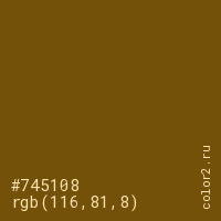 Цвет #745108 в цветовой модели RGB обозначается тремя октетами (116, 81, 8) в десятичном формате и #745108 в шестнадцатиричном (hex) формате, которые являются интенсивностью красного 116 (hex 74), интенсивность зелёного 81 (hex 51) и интенсивность синего 8 (hex 08).