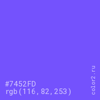 Цвет #7452FD в цветовой модели RGB обозначается тремя октетами (116, 82, 253) в десятичном формате и #7452FD в шестнадцатиричном (hex) формате, которые являются интенсивностью красного 116 (hex 74), интенсивность зелёного 82 (hex 52) и интенсивность синего 253 (hex FD).