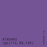 Цвет #745495 в цветовой модели RGB обозначается тремя октетами (116, 84, 149) в десятичном формате и #745495 в шестнадцатиричном (hex) формате, которые являются интенсивностью красного 116 (hex 74), интенсивность зелёного 84 (hex 54) и интенсивность синего 149 (hex 95).
