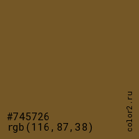 Цвет #745726 в цветовой модели RGB обозначается тремя октетами (116, 87, 38) в десятичном формате и #745726 в шестнадцатиричном (hex) формате, которые являются интенсивностью красного 116 (hex 74), интенсивность зелёного 87 (hex 57) и интенсивность синего 38 (hex 26).