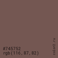 Цвет #745752 в цветовой модели RGB обозначается тремя октетами (116, 87, 82) в десятичном формате и #745752 в шестнадцатиричном (hex) формате, которые являются интенсивностью красного 116 (hex 74), интенсивность зелёного 87 (hex 57) и интенсивность синего 82 (hex 52).