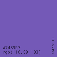 Цвет #7459B7 в цветовой модели RGB обозначается тремя октетами (116, 89, 183) в десятичном формате и #7459B7 в шестнадцатиричном (hex) формате, которые являются интенсивностью красного 116 (hex 74), интенсивность зелёного 89 (hex 59) и интенсивность синего 183 (hex B7).
