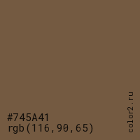 Цвет #745A41 в цветовой модели RGB обозначается тремя октетами (116, 90, 65) в десятичном формате и #745A41 в шестнадцатиричном (hex) формате, которые являются интенсивностью красного 116 (hex 74), интенсивность зелёного 90 (hex 5A) и интенсивность синего 65 (hex 41).