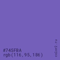 Цвет #745FBA в цветовой модели RGB обозначается тремя октетами (116, 95, 186) в десятичном формате и #745FBA в шестнадцатиричном (hex) формате, которые являются интенсивностью красного 116 (hex 74), интенсивность зелёного 95 (hex 5F) и интенсивность синего 186 (hex BA).