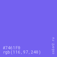 Цвет #7461F0 в цветовой модели RGB обозначается тремя октетами (116, 97, 240) в десятичном формате и #7461F0 в шестнадцатиричном (hex) формате, которые являются интенсивностью красного 116 (hex 74), интенсивность зелёного 97 (hex 61) и интенсивность синего 240 (hex F0).